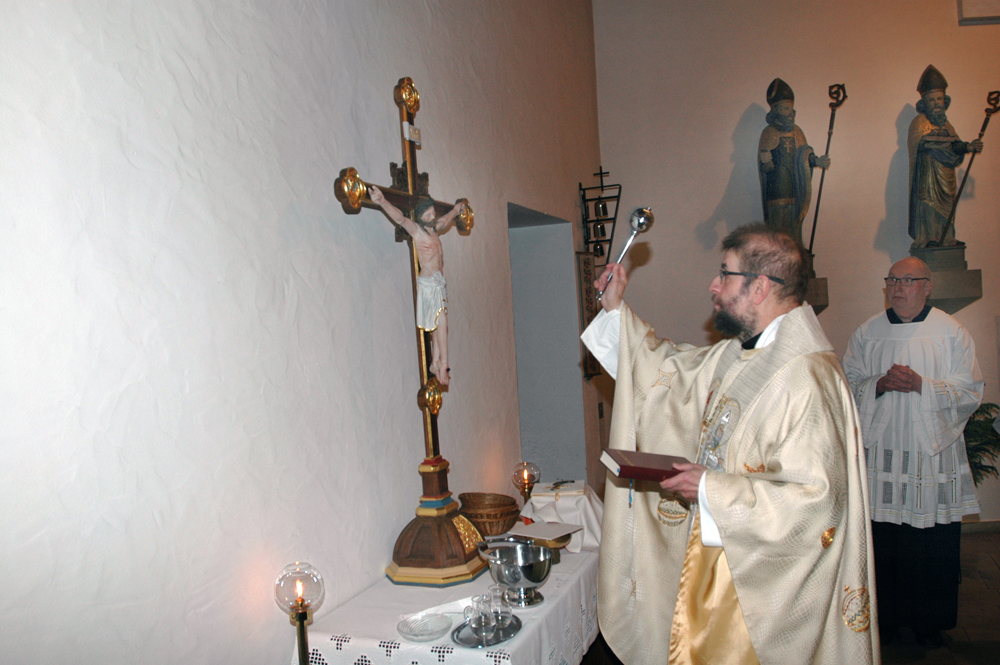 Der älteste Gegenstand der Germeter Pfarrkirche St. Nikolaus ist am Samstag feierlich von Pastor i.R. Alfons Weskamp gesegnet worden.