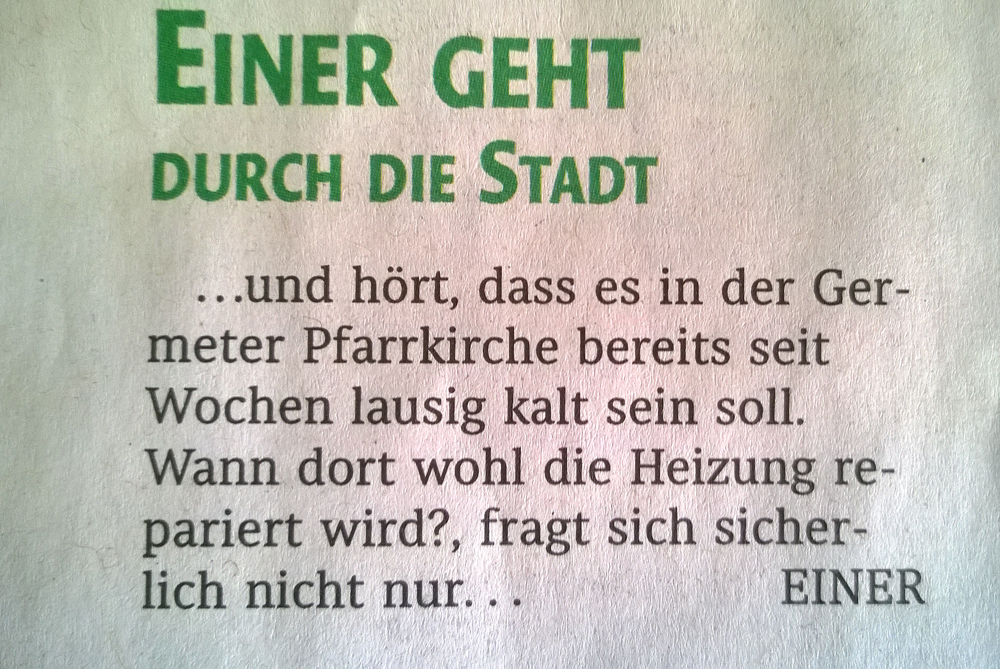 Vielen Dank an den kritischen Leser des WESTFALEN-BLATTES, dem aufgefallen ist, dass es in der Germeter Pfarrkirche derzeit lausig kalt ist. Tatsächlich: Die Heizung war defekt. Die Reparatur dauerte etwas länger, soll aber am Montag beendet sein.