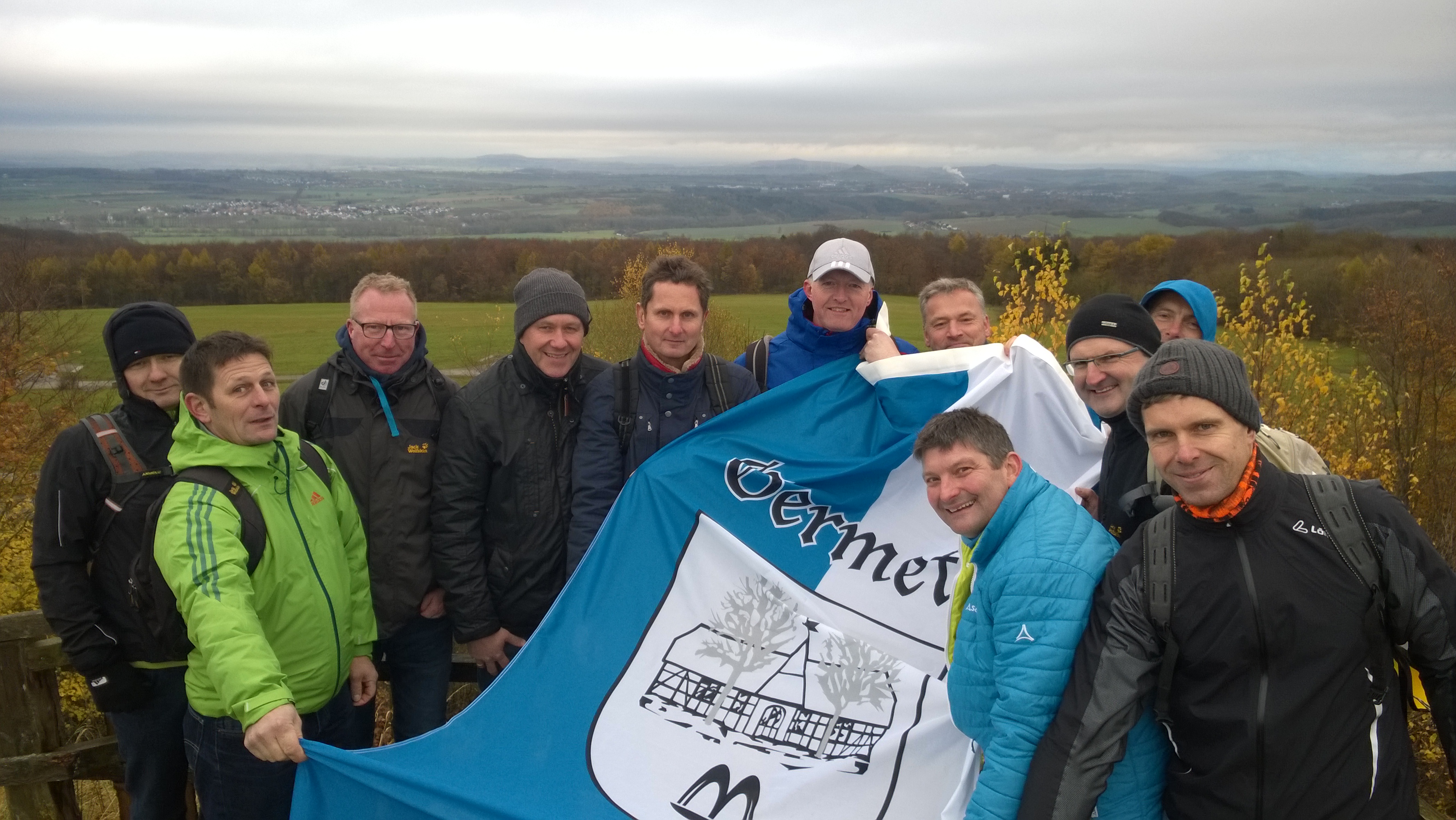 Zum Foto: So könnte es aussehen: Mitglieder des Germeter Schützenvereins haben die Fahne schon einmal bis auf den Quast bei Diemelstadt getragen. Solche Aufnahmen und Fotos aus noch weit entfernteren Orten sucht der Schützenverein des Luftkurortes bis 18. November. Das Bild zeigt (hinten von links) Bernd Köring, Stefan Waldeier (Waldwinkel), stv. Kassierer Marco Böx, Stefan Köring, Kassierer Dirk Bartoldus, Schriftführer Volker Schweins, Fahnenoffizier Maik Farack, und stv. Vorsitzenden Carsten Sommerfeld sowie (vorne von links) Fähnrich Jürgen Vahle, Marc Engemann und Feldwebel Tobias Hoppe.