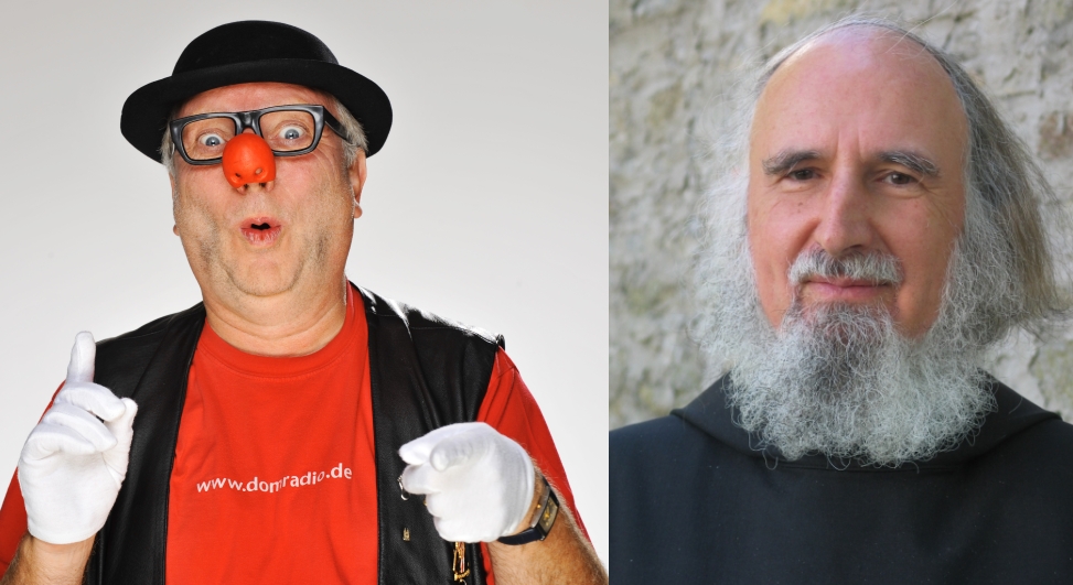 Zum Foto: Büttenredner Willibert Pauels (links) und Benediktinerpater Anselm Grün treten 2018 im Zuge des Ortsjubiläums in Germete auf.