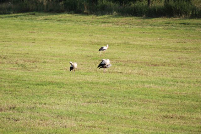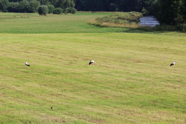 In den Germeter Diemelwiesen hält sich zurzeit seltener Besuch auf. Seit einigen Tagen sind drei Störche in den frisch gemähten Wiesen zu Gast und suchen dort nach Nahrung.