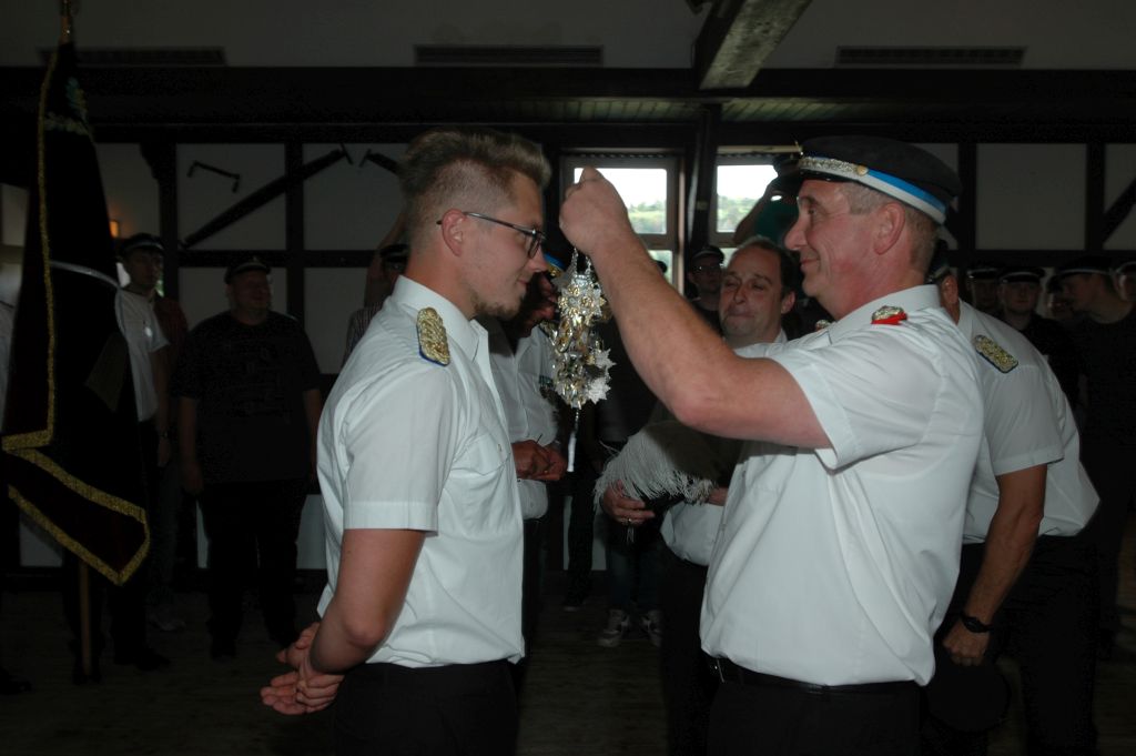 Oberst Jörg Köring hängt Eric Stietz die Kette um und krönt ihn damit zum neuen König.