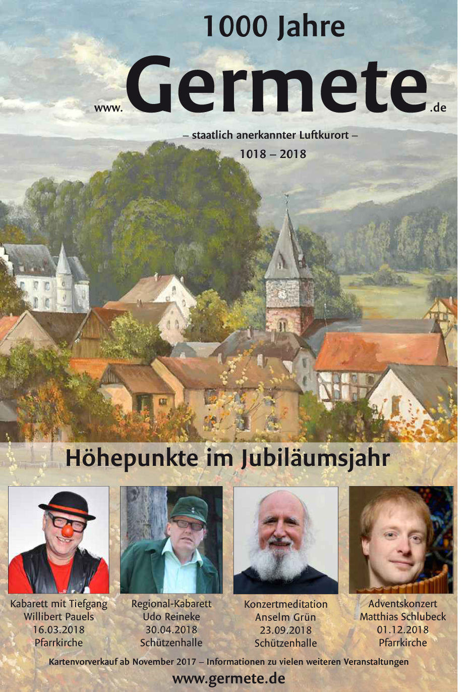 Auf der Werbeseite aufgelistet wurden daher lediglich die kulturellen Höhepunkte, die im Jubiläumsjahr stattfinden und für die Karten erworben werden müssen. Daneben gibt es zahlreiche weitere Veranstaltungen, die spätestens mit der Terminabsprache in wenigen Wochen auch verbindlich sind. Auf der Internetseite www.germete.de soll zeitnah darüber informiert werden.